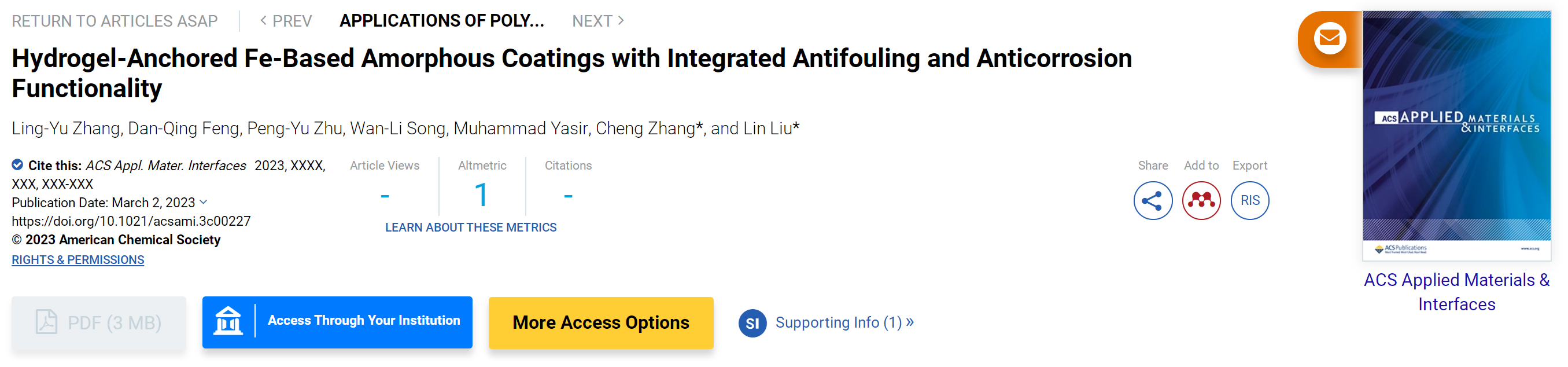 華中大柳林教授團隊 ACS AMI:防腐防污功能一體化水凝膠改性鐵基非晶涂層