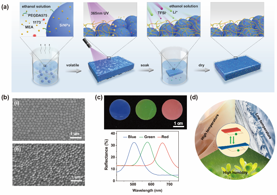 光子晶體是一類具有介電常數(shù)周期性的光學(xué)材料,可以反射入射光的特定波長而顯示出結(jié)構(gòu)色。將光子晶體與離子導(dǎo)體結(jié)合可得到光子晶體離子導(dǎo)體,是實現(xiàn)具有光學(xué)和電學(xué)雙重信號輸出柔性離子導(dǎo)體的有效途徑。然而,現(xiàn)有的光子晶體離子導(dǎo)體材料,很難兼顧機(jī)械性能、離子電導(dǎo)率和結(jié)構(gòu)色。這是因為:一方面,周期性排列的不同介電材料存在力學(xué)難匹配、界面不穩(wěn)定等問題,使得機(jī)械性能與結(jié)構(gòu)色之間存在一定的權(quán)衡;另一方面,基于大量溶劑的離子導(dǎo)體,溶劑含量對離子電導(dǎo)率和機(jī)械強(qiáng)度的影響也存在此消彼長的關(guān)系。