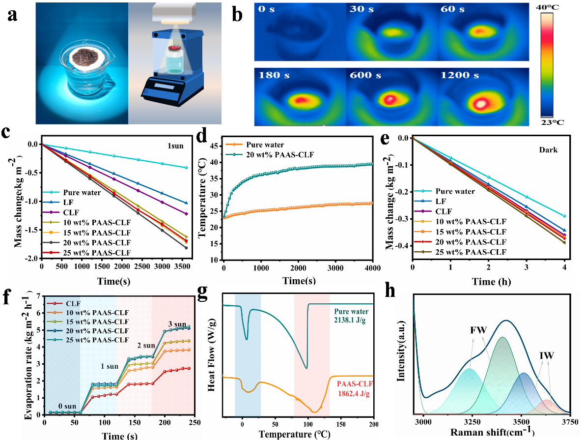 研究發現PAAS-CLF具備良好的吸光性能、優異的水運輸能力和理想的蒸發性能。通過DSC和Roman光譜表征進一步研究了蒸發器中自由水(FW)、中間水(IW)和結合水(BW)中氫鍵的狀態,表明聚電解質水凝膠的網絡結構還可有效降低蒸發焓,提高蒸發速率。除此之外,還探究了聚電解質水凝膠濃度、凝膠涂層厚度、蒸發器孔隙度演變情況等對PAAS-CLF蒸發性能的影響。
