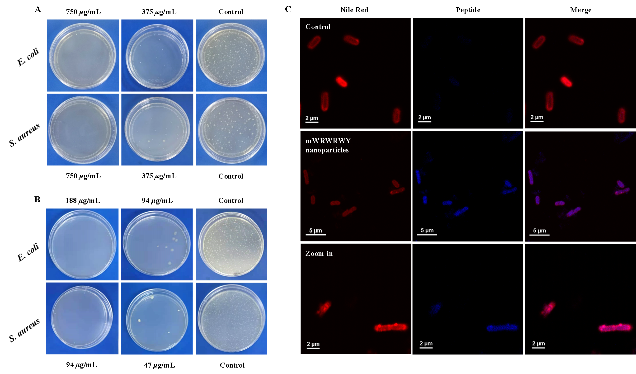 2. A-B)多肽在氧化前和氧化后的最低抑菌濃度C)大腸桿菌與多肽納米顆粒共孵育后的激光掃描共聚焦顯微鏡圖。