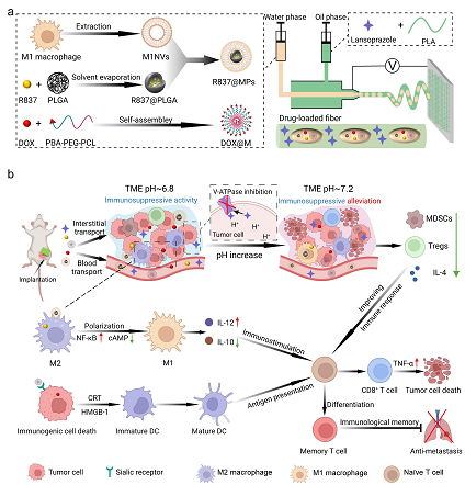 西南交通大學周紹兵教授團隊開發了一種具有多級結構的電紡纖維裝置作為局部藥物遞送系統,用于重塑酸性腫瘤微環境 (TME),以提高免疫療法的治療效果。纖維基質中的質子泵抑制劑(PPIs)持續釋放以抑制腫瘤細胞內H+的外排,重塑酸性TME。纖維內腔中的靶向膠束和 M1 巨噬細胞膜包被的納米顆粒可分別誘導腫瘤細胞的免疫原性細胞死亡 (ICD)和腫瘤相關巨噬細胞(TAM)的表型轉化。TME中酸度的緩解進一步促進了ICD 和TAM 的極化,緩解了免疫抑制微環境并協同增強了抗腫瘤免疫反應。
