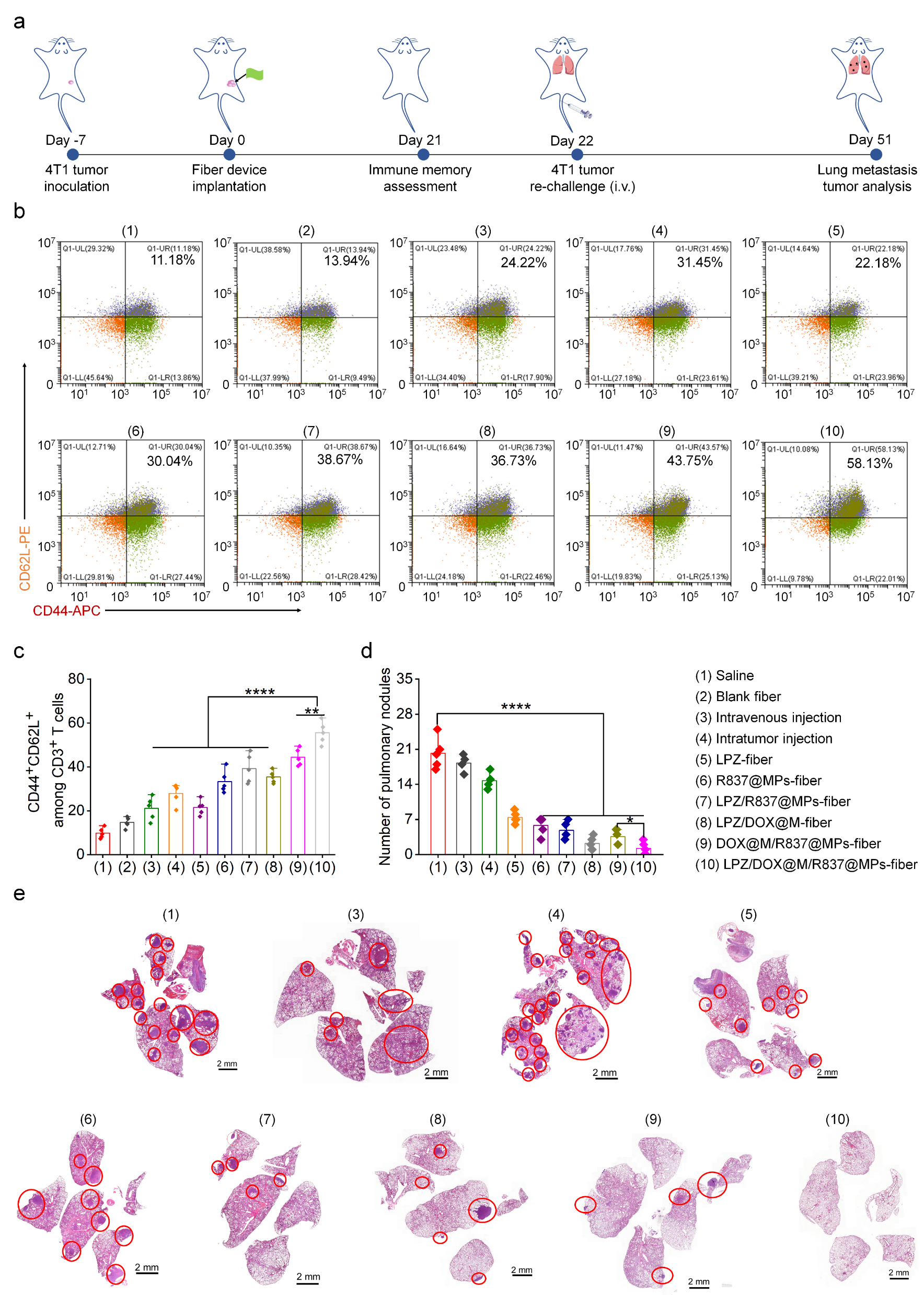 圖3.免疫記憶效應及預防體內腫瘤轉移。a.免疫記憶監測和抑制腫瘤轉移示意圖。b.脾內中藥代表性流式細胞圖(CD3+CD8+CD44+CD62L+)。c.脾臟分化中藥含量統計結果。d.肺結節計數統計結果。e.肺H&E染色圖像。