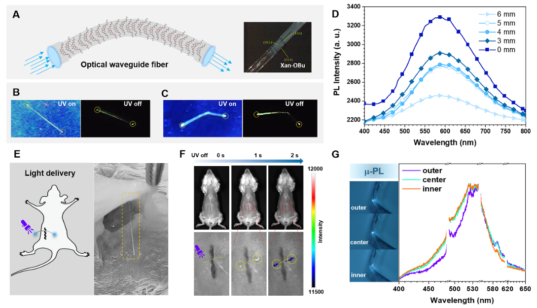 3 室溫磷光塑性Xan-OBu晶體的光波導(dǎo)性質(zhì)及其在生物體內(nèi)的光傳遞應(yīng)用