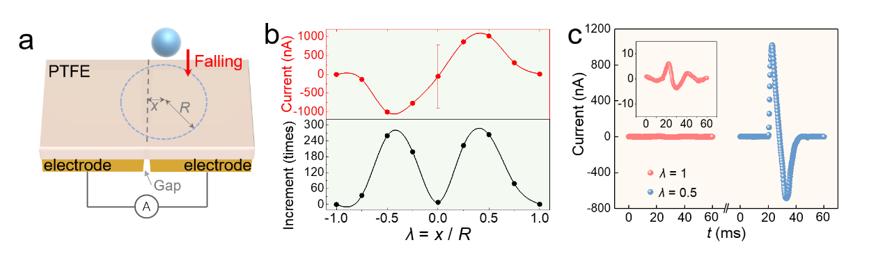 根據電容的關系,作者進一步推導出了電荷轉移數目隨不同撞擊位置的變化規律(圖3)。推導結果與實驗測量的結果很好地吻合。同時,作者還對不同液滴撞擊位置中的電荷轉移過程進行了模擬,模擬結果也證實了之前的推論。該研究解釋了液滴在DBE-TENGs上的電荷轉移機制,也揭示了液滴撞擊不同位置時鋪展面積相同但其界面電容上感應的電荷差異巨大的原因。