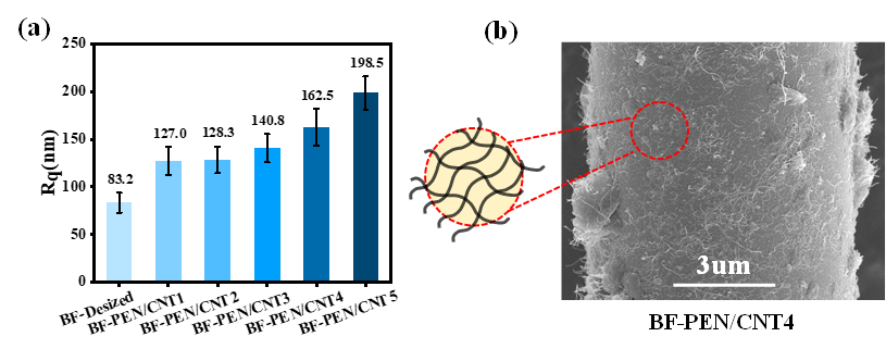 圖 3 玄武巖纖維表面粗糙度(a)和表面涂敷形貌(b)。