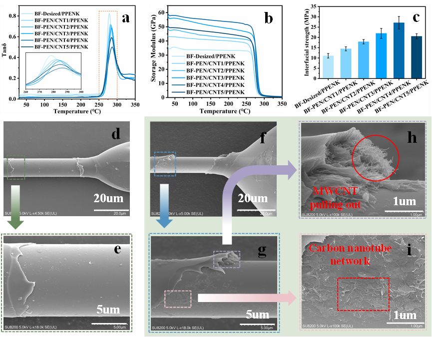 圖 4 BF/PPENK復(fù)合材料動態(tài)機(jī)械性能(a,b),界面結(jié)合強度(c);微滴脫粘測試后形貌:BF-Desized/PPENK(d,e),BF-PEN/CNT4/PPENK(f-i)。