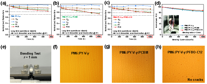 小結:作者團隊開發了聚富勒烯受體(PFBO-C12)作為客體組分,并應用于全聚合物太陽能電池中,使其光伏轉化過程得到有效促進,能量效率得到有效提升(18.0%)。與此同時,聚富勒烯客體聚合物也使全聚合物太陽能電池的光穩定性和機械耐久性得到了有效提升。這項工作表明,引入聚富勒烯作為客體組分,是實現高效、穩定的三元全聚合物太陽能電池的有效途徑。