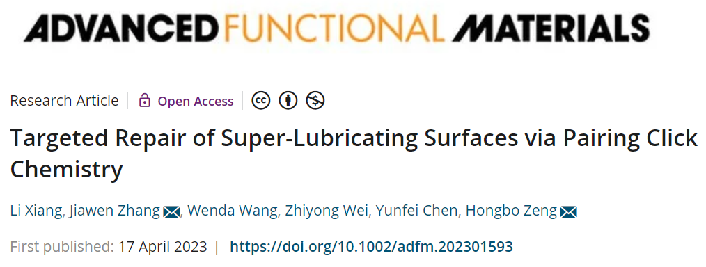 先進的表面工程技術(shù)已實現(xiàn)了可媲美天然潤滑系統(tǒng)的仿生潤滑表面設(shè)計制備,極大地推動了植入式醫(yī)療器件如人工心臟泵、人造關(guān)節(jié)軟骨等在生物醫(yī)療領(lǐng)域的廣泛應用。植入人體后,這些器件需要在長達十幾年甚至幾十年的工作周期中保持高密度長壽命的工作特性,以維系人體生命健康和正常機能運轉(zhuǎn)。然而,在相對運動的過程中,器件中的摩擦副部分會不可避免地發(fā)生摩擦磨損,一旦摩擦副表面發(fā)生損壞,它們的潤滑性通常會不可逆地下降,造成器件功能失效。究其原因在于,從表面剝離的潤滑涂層材料往往:1)由于不可逆的鍵斷裂無法重新粘結(jié)到原始基面上;2)通過非特異性相互作用橋接黏附兩個摩擦表面。常規(guī)的應對措施主要集中于通過在涂層材料中引入強黏附基團如鄰苯二酚,來增強潤滑涂層對表面的黏附力,提高摩擦副表面的耐磨性。這種手段雖然可以一定程度上延長器件的工作壽命,卻無法從根本上解決摩擦副因磨損而導致潤滑失效的問題。