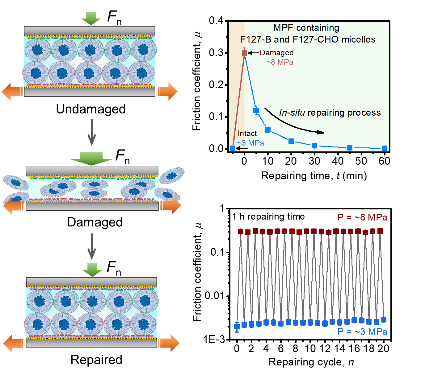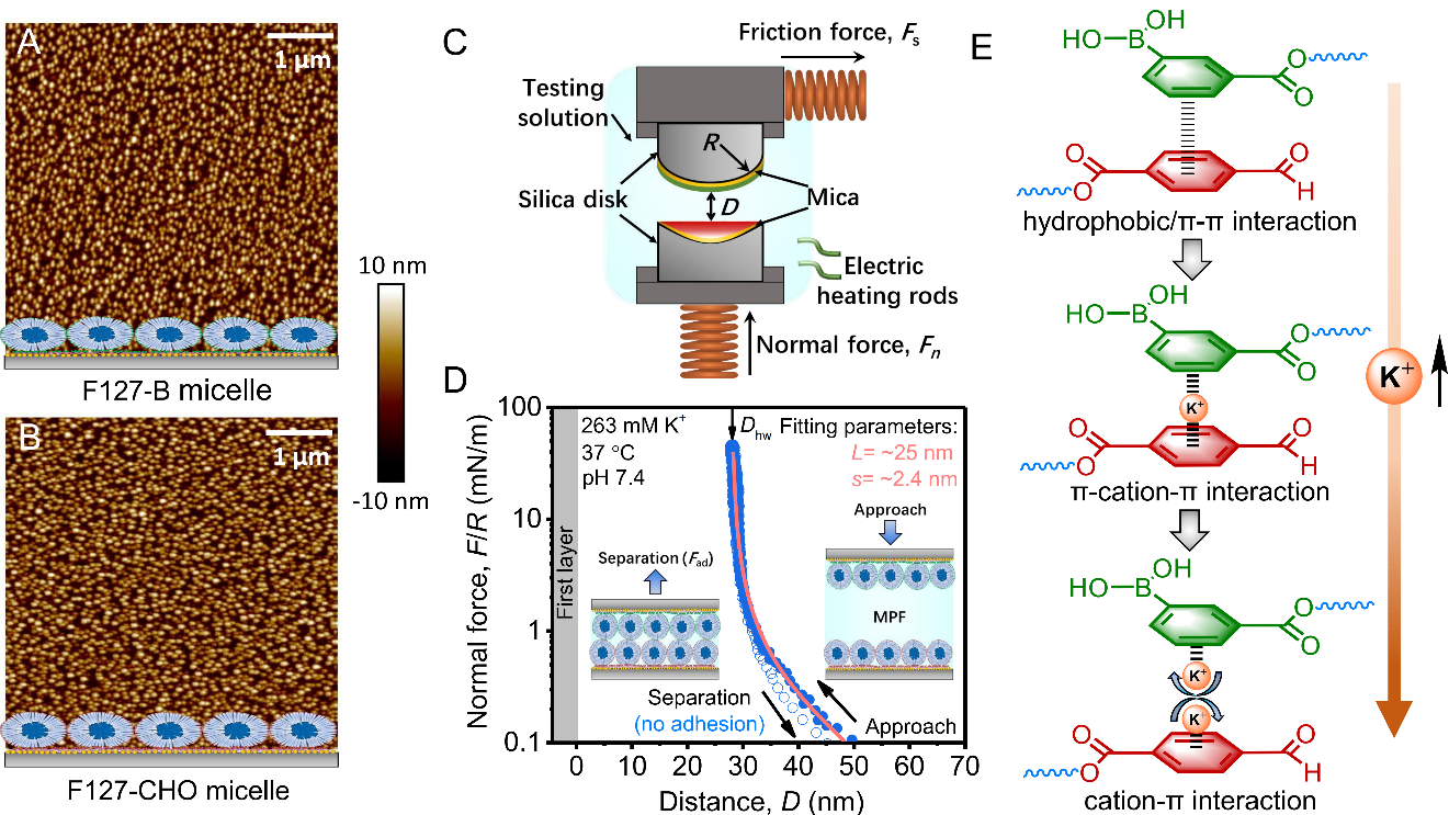 小結(jié):本文基于動態(tài)共價鍵引導的表面識別策略,將F127-B和F127-CHO潤滑膠束選擇性結(jié)合到配對表面,開發(fā)了一種具有定向自修復性的新型水化超潤滑系統(tǒng)。這種摩擦副在生理高壓下表現(xiàn)出優(yōu)異的潤滑性。而在發(fā)生磨損時,連接潤滑膠束與相應表面的動態(tài)共價鍵優(yōu)先解離以耗散能量,但仍能動態(tài)重建,從而實現(xiàn)在重復損傷情況下對兩個潤滑表面的原位定向修復,避免表面橋接,恢復摩擦副高潤滑性。該工作為開發(fā)具有定向自修復潤滑表面提供了設(shè)計思路,對解決傳統(tǒng)潤滑表面因磨損而導致的潤滑性下降具有一定的啟示。