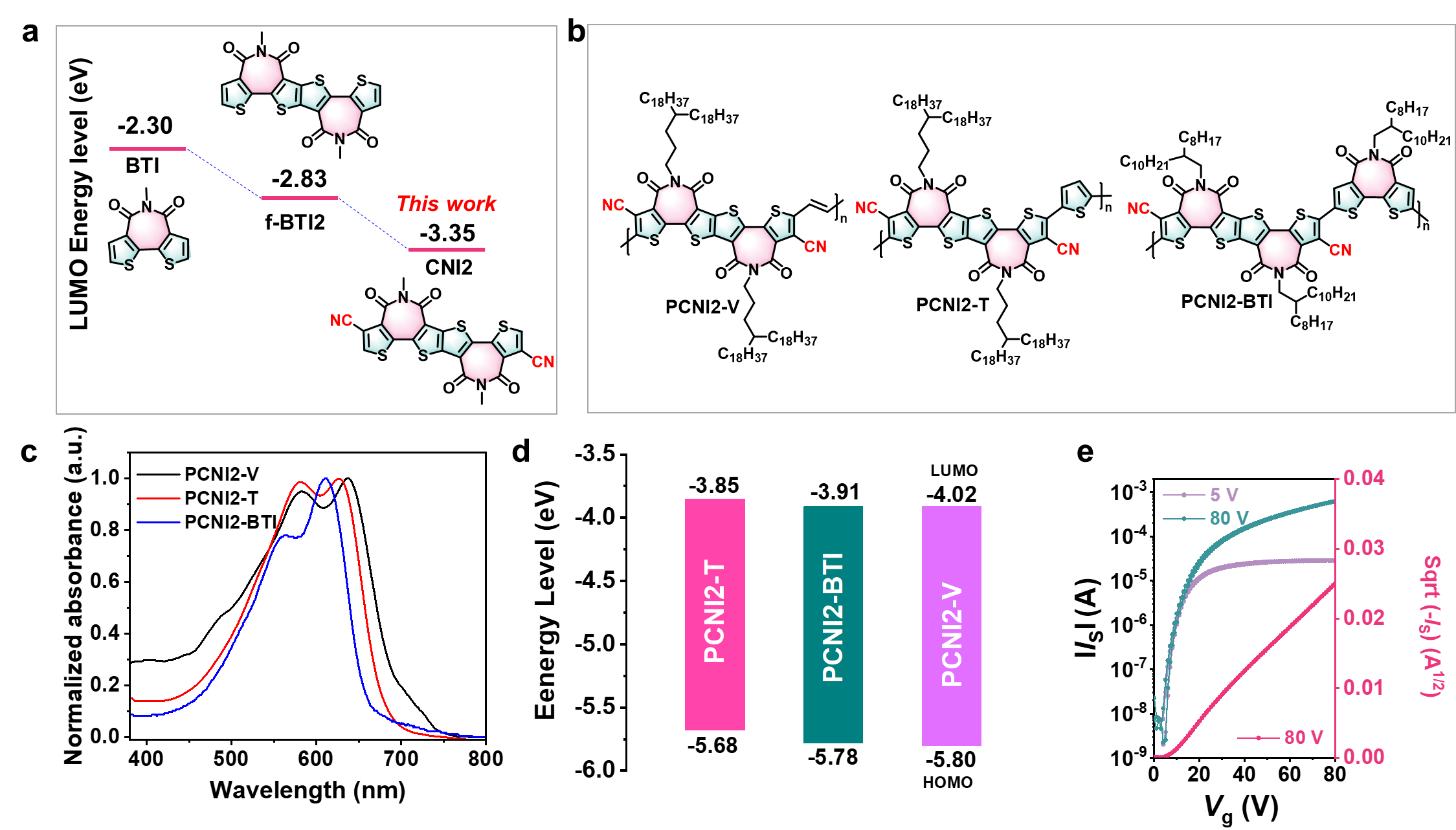 圖1 (a)雙噻吩酰亞胺、并環雙噻吩酰亞胺二聚體及雙氰基化并環雙噻吩酰亞胺二聚體的DFT計算結果。(b)PCNI2-V、PCNI2-T和PCNI2-BTI的結構示意圖。(c)三個高分子在薄膜狀態下的紫外-可見吸收光譜圖。(d)三個高分子的能級示意圖。(e)基于旋涂PCNI2-BTI的有機薄膜晶體管器件轉移曲線圖。