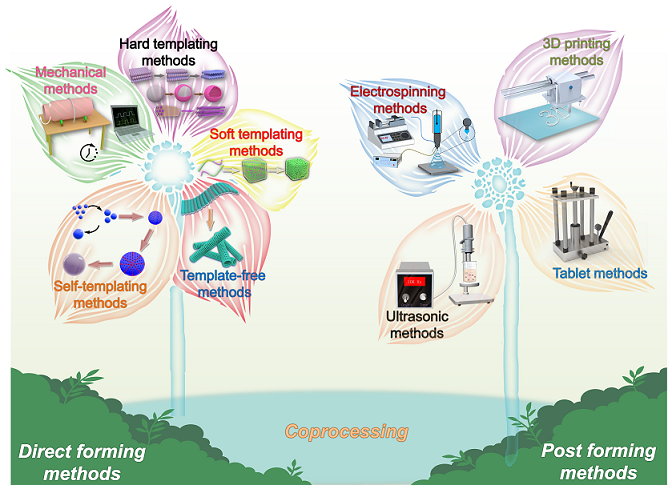 圖2.多孔有機聚合物的直接組裝和后期成型方案。