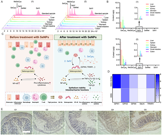體內的治療效果。該研究首先評估了SHSe納米硒凝膠微珠在DSS誘導的IBD小鼠體內的靶向能力和在結腸中的停留時間。接著,通過對比不同處理組IBD小鼠中的結腸長度、便血情況、體重和脾重的變化發現,口服SHSe納米硒凝膠微珠后的這些指標均趨近于對照組。并且HE染色的結腸切片進一步表明,口服SHSe納米硒凝膠微珠后的治療組中杯狀細胞和腸隱窩的數量明顯增多,且炎癥細胞的浸潤明顯減少(Control組(G1)、DSS組(G2)、DSS+SA組(G3)、DSS + HA-Se組(G4)、DSS + SHSe組(G5))。