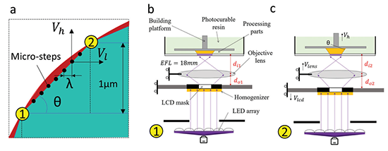 基于光固化成型(Vat Photopolymerization)的三維打印技術,由于其良好的定制性和無需裝配的一體成型能力,在制造自定義光學元件方面具有極大的潛力。然而,光學透鏡的加工工藝需要具備納米級的表面粗糙度和微米級的形狀精度,這種精度要求超出了大多數三維打印技術的能力范圍。現有的透鏡三維打印工藝,例如雙光子聚合光固化成型,通過降低打印層厚和固化單元面積來實現納米級表面粗糙度,但這限制了加工速度和加工面積。目前,對于大尺度光滑表面光學透鏡的一體成型三維打印仍然存在挑戰。