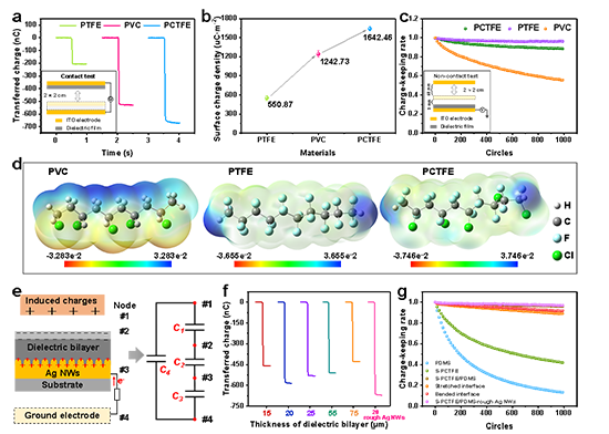圖2. 靜電傳感界面的材料優化與輸出表征。(a、b)高壓極化后PTFE、PVC與PCTFE的轉移電荷與表面電荷密度。(c)三種材料的非接觸式電荷保持能力。(d)DFT計算的材料表面電勢。(e)設計的雙介電層與粗糙表面Ag NW電極模型。(f、g)優化后的靜電傳感界面的轉移電荷與電荷保持能力。
