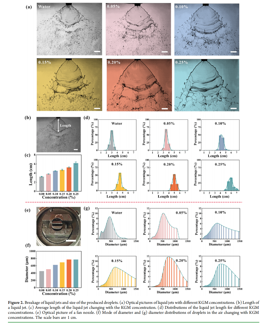 近日,福建農(nóng)林大學(xué)龐杰、邱仁輝、吳淑一共同指導(dǎo)的多學(xué)科交叉研究團(tuán)隊(duì)研究顯示,微量(0.2%)魔芋葡甘聚糖(KGM生物大分子添加到溶液中,即可顯著提高液滴在空氣中的形成、液滴在超疏水和親水表面的碰撞和鋪展等噴灑全過程中各環(huán)節(jié)的效率。隨著KGM濃度從0增加到0.20%,液膜穩(wěn)定長(zhǎng)度、空氣中液滴直徑、超疏水表面上液滴保留率、親水表面上液滴有效鋪展率、液橋壽命分別增加了63.2%69.5%11.2%77%132%。該效果歸因于噴灑過程中,柔性生物大分子的拉伸和松弛過程中高分子鏈內(nèi)的能量?jī)?chǔ)存和耗散,提高了溶液粘度并抑制了液體運(yùn)動(dòng)的不穩(wěn)定性。