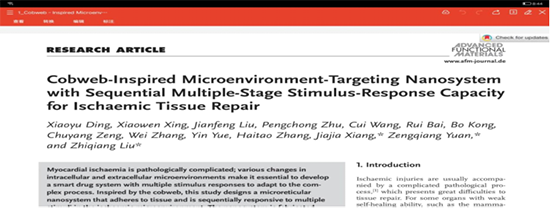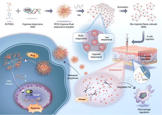 圖1. 蛛網啟發的具有微環境靶向性及多級響應功能的粘性納米系統制備及用于缺血組織修復的機制。