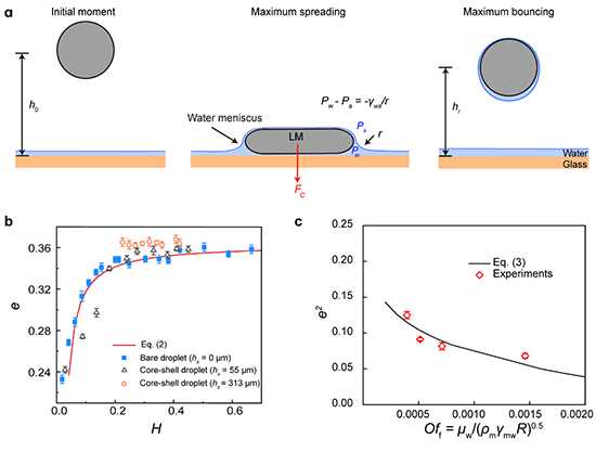 圖3.LM液滴彈跳的理論模型(a)LM液滴彈跳的示意圖(b)理論的恢復系數和水膜厚度的變化(f)恢復系數和Of數的變化