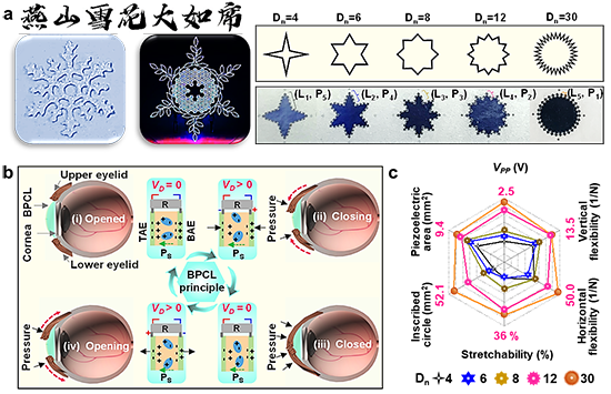 圖2. 壓電角膜接觸鏡(BPCL)的性能調控優化。(a)雪花啟發結構設計(引用冬奧會圖片;燕山雪花大如席)。(b)眨眼驅動器件的工作原理。(c)壓電單元的性能優化。