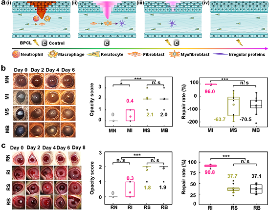 圖3. 壓電角膜接觸鏡的干預效果驗證。(a)器件干預對雙重作用生長因子的調控修復機理。(b)小鼠角膜干預修復驗證。(c)兔子角膜干預修復驗證。