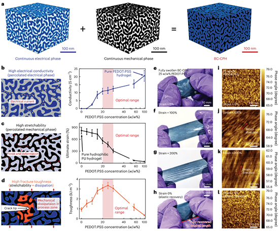 為了克服以上問題,該團隊提出了雙連續(xù)相導(dǎo)電聚合物水凝膠(BC-CPH)設(shè)計策略,以PEDOT:PSS為電學(xué)相、親水性聚氨酯(PU)為機械相,利用兩種物質(zhì)在水-乙醇體系中的溶解性差異進行相分離調(diào)控,在優(yōu)化條件下制備了PEDOT:PSS-PU雙連續(xù)相導(dǎo)電聚合物水凝膠。基于電學(xué)相和機械相的雙連續(xù)結(jié)構(gòu),所獲得的BC-CPH同時展現(xiàn)出高電導(dǎo)率(> 11 S cm-1)、高拉伸性(> 400%)以及高斷裂韌性(> 3,300 J m-2),有效實現(xiàn)了PEDOT:PSS電學(xué)性能與PU力學(xué)性能的融合(圖 1)。