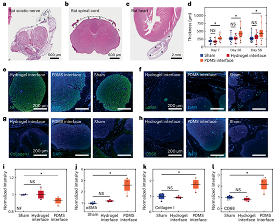 體內(nèi)生物相容性研究結(jié)果顯示,與傳統(tǒng)生物電子器件相比,全水凝膠生物電極由于其類組織特性引起的免疫反應(yīng)明顯降低,周圍組織幾乎沒有炎癥或疤痕(圖 6)。通過采用全水凝膠生物電子器件替代傳統(tǒng)的金屬電極,可以最大限度地減少金屬電極器件可能帶來的并發(fā)癥和副作用。