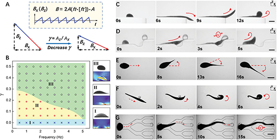 鑒于此,哈爾濱工業大學李天龍團隊、鄭州大學張偉偉團隊提出了一種利用磁性液滴構建阿米巴機器人的磁驅操控策略(圖1),并結合仿真解析了偽足的生成及運動機制。該機器人可以在單偽足、雙偽足和運動模式間自由切換,并復現了變形蟲偽足的伸縮、彎曲、捕捉和運動等操作(圖2)。偽足賦予了機器人卓越的機動性,包括跨越復雜三維地形以及液相中懸浮游動等(圖3)。此外,受“毒液”的啟發,他們還研究了阿米巴機器人的吞噬和寄生行為,并探索了其在試劑分析、微化學反應、結石清除和藥物溶栓等場景的應用潛力(圖456)。