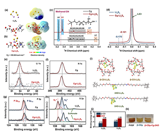 圖2 (a)Li2S4和Cg的靜電勢分布;(b) 復(fù)合物的穩(wěn)定構(gòu)型和結(jié)合能;(c)1H NMR譜圖;(d)7Li NMR譜圖;(e-h) Li 1s、N 1s、P 2p和S 2p XPS分峰譜圖;(i)理論吸附模型和(j)吸附能;(k) PVDF、β-CDp和 β-CDp-Cg-2AD粘結(jié)劑靜態(tài)吸附后Li2S6溶液的光學(xué)照片。