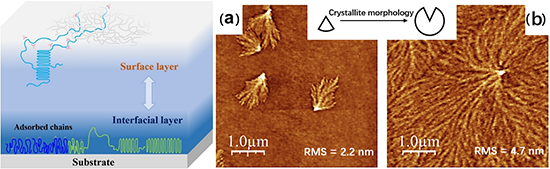 高分子納米薄膜廣泛應用于納米芯片、微流控、電子封裝等領域。納米高分子薄膜的物理性質與宏觀材料存在很大差異,其微觀分子運動、結晶和流變等受到表面和界面的影響而發生變化。隨著薄膜厚度降低,與空氣接觸的表面以及基底附近界面區域的占比增大;導致納米薄膜的結晶行為很大程度上受控于表界面效應及其相互作用。例如,表面區域高分子鏈段運動能力增強造成高分子薄膜在本體玻璃化溫度以下可以結晶;而高分子在基底界面的吸附限制了分子鏈的擴散和遷移,造成界面區域結晶減緩,甚至無法結晶。盡管高分子薄膜結晶已受到廣泛關注,然而尚缺乏針對表界面影響的規律及機制的系統認識和總結。