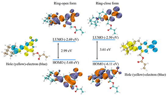 4. NSPMA的開環(huán)態(tài)與閉環(huán)態(tài)的前線分子軌道圖以及從S0S1態(tài)的空穴-電子密度分布圖