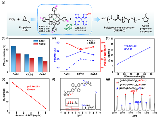 圖2 鋁卟啉配合物(CAT)與“三合一”ACC催化體系下的CO2與環氧丙烷共聚反應性能及產物表征。