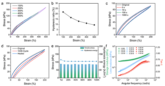 由于靜電作用的引入抑制了疏水作用區域的聚集,p(EA-co-DAC)/STPP水凝膠在拉伸過程中的回滯顯著減小,同時該水凝膠表現出更快的自恢復性能和良好的循環穩定性。通過流變測試中的鹽-時等效方法對p(EA-co-DAC)/STPP 水凝膠的研究發現,該水凝膠快速的自恢復來源于其較短的靜電作用松弛時間(<0.026 s)和相對較小的疏水相區尺寸。