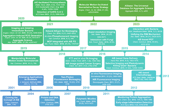圖1. AIE在生命科學(xué)和健康領(lǐng)域的重要里程碑。