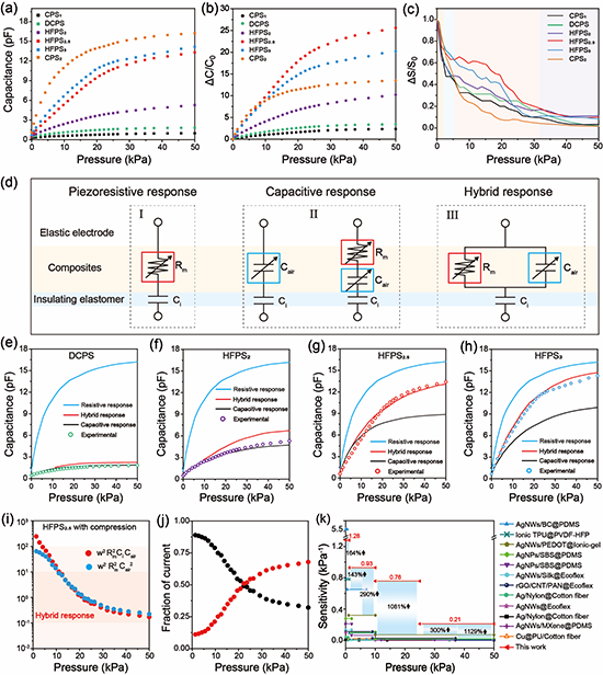 圖3 雜化響應纖維傳感器的電容響應行為及理論分析。(a)傳感器電容值隨壓力變化;(b)傳感器相對電容隨壓力變化;(c)傳感器的歸一化靈敏度與壓力的關系;(d)三種可能的HFPSs等效電路;DCPS(e)、HFPS2(f)、HFPS2.5(g)、HFPS3(h)的理論和實驗電容變化;(i)HFPS2.5的雜化響應壓力范圍;(j) HFPS2.5中電阻和電容的電流分數;(k)HFPS2.5與近年報道的電容式纖維壓力傳感器的靈敏度對比。