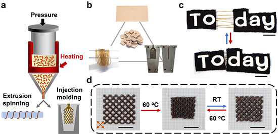 熔融紡絲和注塑成型是兩種常見的高分子工業化生產方式,本工作進一步驗證了液晶軟體驅動器能夠通過這兩種方法制備。如圖3所示,利用熔融紡絲方式,本工作獲得了連續的液晶纖維,HB-TLCE纖維可以穿入繡花針中進行刺繡或縫合。在25-60 °C的熱循環下,通過液晶纖維縫合的兩塊布料被絲線的驅動力牽引,其圖案能夠在“To”“day”和“Today”之間可逆切換。以上結果表明,HB-TLCE纖維在智能織物方面具有很大的應用潛力。利用注塑成型方式,本工作能夠在秒級時間內快速制備具有網格結構的驅動器,該網狀結構的驅動器具有兩個正交的取向方向,并在熱循環下(25 °C -60 °C)展現出可逆的驅動行為(網格尺寸:16.5 × 17.5 mm2?14.5 × 15.5 mm2)。以上結果表明,規模化和定制化地生產液晶軟體驅動器將成為可能。