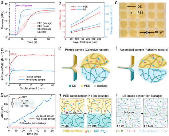 圖3 離電傳感器的可打印性與性能 (a) PEE存儲模量和損耗模量隨光固化時間的變化曲線 (b) 固化時間與能量密度隨層厚的變化關系 (c) 打印的PEE陣列展示 (d) 3D打印和手動組裝的PEE/DE雙層結構的180°剝離曲線 (e) 3D打印的PEE/DE雙層結構本體斷裂示意圖 (f) 手動組裝的PEE/DE雙層結構界面斷裂示意圖 (g) 基于PEE和基于LiTFSI摻雜離子彈性體的電容式傳感器的ΔC/C0隨時間變化曲線 (h) 基于PEE的電容式傳感器無離子泄漏 (i) 基于LiTFSI摻雜離子彈性體的電容式傳感器離子泄漏示意圖