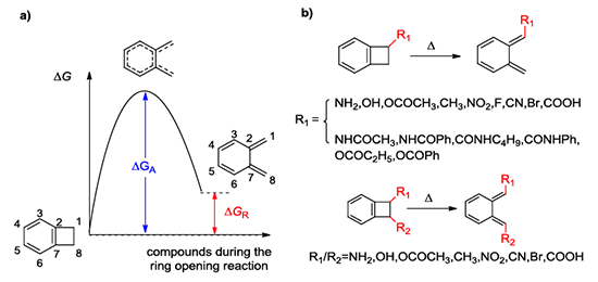 1  a) 苯并環丁烯的熱開環過程  b) 單取代和雙取代苯并環丁烯的熱開環反應式