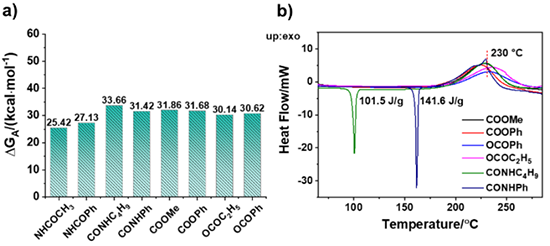 3 a)化合物1~8的開環活化能壘計算結果 b化合物3~8DSC曲線