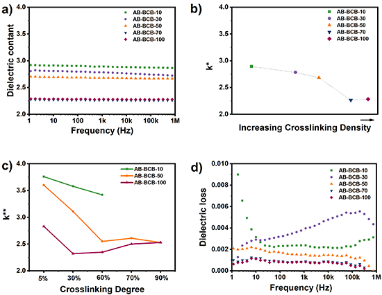 介電常數主要是由極化單元對外加交流電場響應的能力決定的。在圖3a-b中,五種完全固化樹脂的介電常數在1 Hz ~ 1 MHz的寬頻率范圍內保持穩定,并且隨著交聯密度的增加,介電常數整體呈下降趨勢。這可能是因為逐漸密集的交聯網絡限制了分子鏈的移動,從而抑制了取向極化,同時微支化結構的增加也提高了聚合物鏈的自由體積。此外,圖3c中模擬的介電常數與交聯密度呈相反的趨勢,隨著交聯程度的增加,介電常數先減小后略有增大,與實驗數據一致。而介電損耗是指介電材料在交變電場的作用下克服分子力而產生偶極取向和極化時,電能轉化為熱能而產生的損耗。在圖3d中,3種玻璃態樹脂(AB-BCB-50AB-BCB-70AB-BCB-100)在較寬的頻率范圍內表現出低而穩定的介電損耗(<0.002)。隨著交聯密度的增加,介電損耗顯著降低,這是因為交聯限制了分子鏈的遷移率,進而可以使取向極化最小化。然而,低交聯密度的AB-BCB-10AB-BCB-30在介電損耗方面表現出不規則的波動,這是因為與高度交聯的聚合物相比,自由鏈段更容易受到頻率干擾。