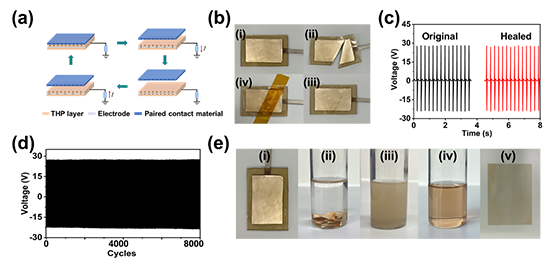 圖2.THP-TENG的自修復(fù)及可回收性能。a)THP-TENG的運(yùn)行機(jī)理。b)THP-TENG的器件修復(fù)過程。c)THP-TENG的輸出性能修復(fù)。d)修復(fù)后的THP-TENG的運(yùn)行穩(wěn)定性。e)THP-TENG的循環(huán)回收過程。