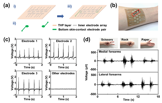 圖3.THP-TENG對(duì)觸覺及電生理信號(hào)的感知性能。a)THP-TENG基傳感器的器件結(jié)構(gòu)。b)粘貼在前臂內(nèi)側(cè)的THP-TENG基傳感器。c)手指在器件表面滑動(dòng)時(shí)傳感器內(nèi)不同電極產(chǎn)生的摩擦電信號(hào)。d)三種不同手勢(shì)下貼于前臂內(nèi)側(cè)和外側(cè)的兩傳感器監(jiān)測(cè)到的肌電信號(hào)。