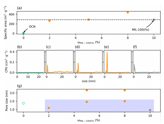 圖3 (a) PVA、(b) OCN/PVA、(c-f) MIL-100(Fe)OCN/ PVA氣凝膠的SEM圖像。