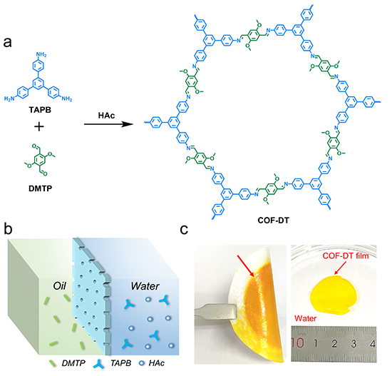 采用膜分離技術實現有機溶劑體系中的分子分離,對石油化工、食品、醫藥等行業中的產品精制與溶劑回收具有重要意義。相較于傳統非晶聚合物膜的無序和隔離孔結構,在膜中構建貫通的有序納米通道有利于促進溶劑快速傳輸和溶質的精確分離。共價有機框架(COFs)材料是一類新興的結晶性多孔材料,可由預先設計的結構單元共價交聯而成,具有高孔隙率和均一剛性的孔結構。由于這些優點,COFs在用作有機溶劑傳輸和精確分子分離的膜材料中具有很大的應用潛力。然而,傳統溶劑熱法制備的COFs通常為不溶不熔的微晶粉末,難以加工成膜。在多孔基底上一步制備大面積、無缺陷的高結晶性COFs膜具有很大的挑戰性。