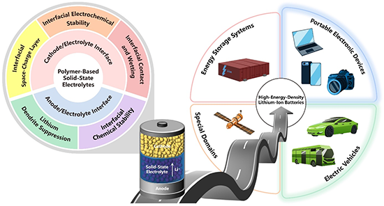 近年來,鋰電池已被廣泛應用于移動電子設備,電動汽車,大型儲能裝置和衛星等特殊領域。其中,移動電子設備和電動汽車的快速發展使得人們對鋰電池的能量密度和安全性需求不斷增加。與使用傳統液態電解液的電池相比,使用聚合物電解質的固態電池具有更高的安全性與能量密度。然而,其內部的電極/聚合物電解質界面仍存在許多問題(圖1),影響電池的應用。