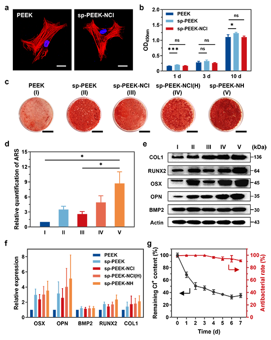 聚醚醚酮(PEEK)具有與天然骨骼相似的彈性模量,已廣泛應用于椎間融合器、人工骨等骨科植入物。然而,由于PEEK缺乏抗菌、促成骨等生物活性,導致其植入物周圍感染和無菌性松動時常發生,嚴重影響手術效果和患者生活質量。目前,研究人員已經開發多種策略來提高PEEK的抗菌和促成骨功能,但強效抗菌能力往往會降低其生物相容性和成骨能力,不利于骨整合。因此,抗菌、促成骨等生物活性的智能集成仍然是一個巨大的挑戰。