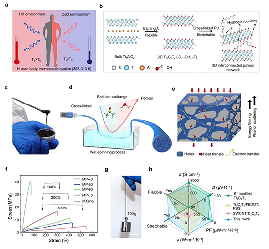 得益于可穿戴生物電子設備的普及,當前的醫療保健系統正從以疾病為中心的反應性模式轉變為以預防和促進健康為重點的個性化模式,但用于可穿戴電子生物設備的可持續驅動仍然是一個很大的挑戰。人體可連續輸出40 mW cm?2的熱量,因此與周圍環境始終存在5 ~ 40K左右的溫差。大量具有研究前景的熱電可穿戴設備已經被廣泛的應用于綠色能源回收,并且和無處不在的傳感器相連。但現有熱電纖維大多為p型材料,且材料電導率、塞貝克系數及熱導率耦合嚴重,力學穩定性等方面仍都面臨巨大挑戰。