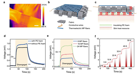 圖4.可拉伸紡織熱電發電機的結構與性能。(a)可穿戴紡織熱電發電機的紅外數字圖像。(b, c)可穿戴織物熱電發電機的結構示意圖和截面示意圖。織物熱電發電機(d)有和沒有絕緣PE泡沫和(e)集成在織物中的8,16和24mp熱電單元的隨時間變化的輸出電壓。(f)織物熱電發電機在不同ΔT值下的輸出電壓。