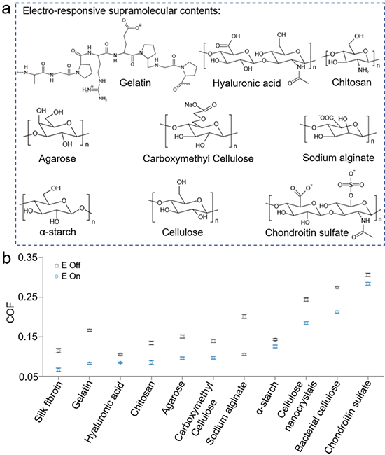 為了探究受黏膜啟發(fā)的超分子-共價水凝膠制備方法的普適性(圖5),實驗中選定的一系列電響應聚合物,其重要特點是高分子鏈的側基是帶電基團,能夠發(fā)生電凝膠化。當把這一類電響應聚合物引入到水凝膠設計中,新制備的水凝膠都表現出電場響應潤滑特性,從而證明了制備方法的普適性。