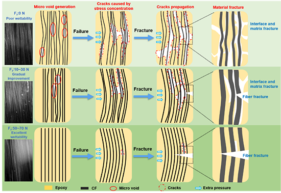 圖5不同張力下復合材料浸潤性及斷裂機制