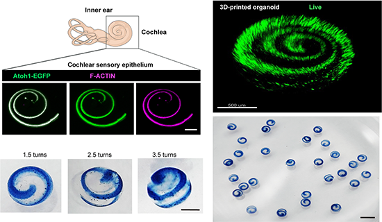 為進一步推進內耳類器官的結構化,本研究還利用3D打印技術結合復合水凝膠,構建了高度類似內耳感覺上皮的螺旋狀結構,這一形態顛覆了以往內耳類器官的囊狀結構,使得內耳類器官邁向結構化。該研究為內耳類器官應用提供了新平臺,為感音神經性耳聾的再生治療策略制定提供了新靶點。