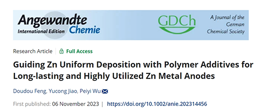 以上研究成果近期以“Guiding Zn Uniform Deposition with Polymer Additives for Long-lasting and Highly Utilized Zn Metal Anodes”為題,發(fā)表在《Angewandte Chemie International Edition》(Angew. Chem. Int. Ed. 2023, e202314456)上。東華大學(xué)化學(xué)與化工學(xué)院博士研究生馮豆豆為文章第一作者,焦玉聰研究員和武培怡教授為論文共同通訊作者。